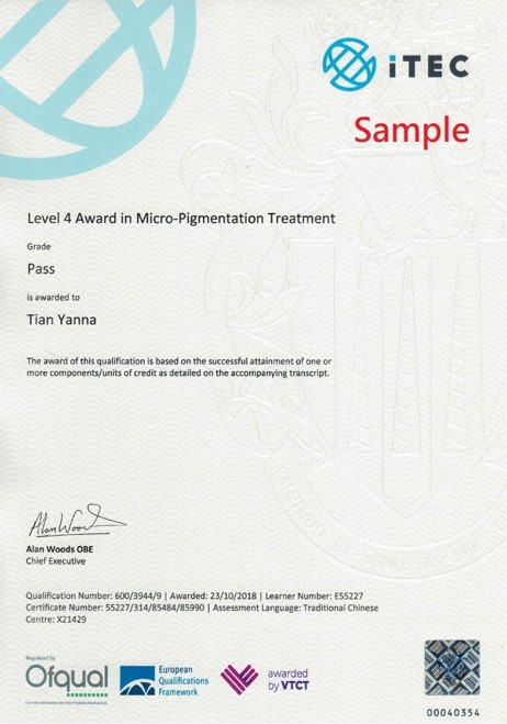 • Level 4 Award in Micro-Pigmentation Treatment(儀器紋繡)